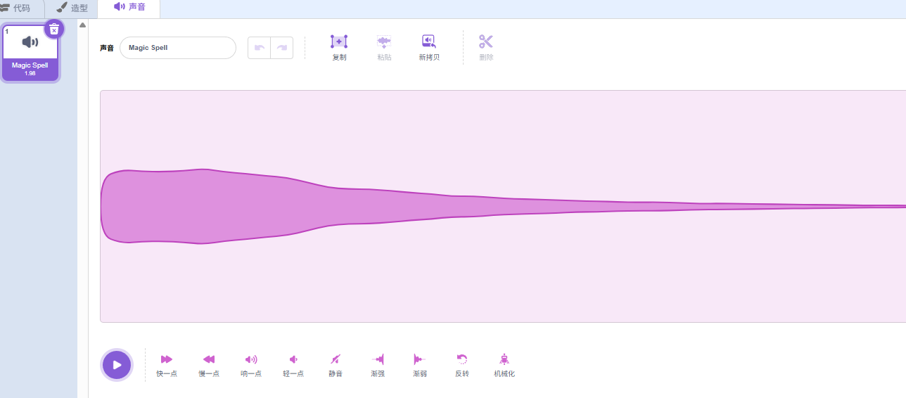 3. 给角色添加声音:点击“声音”标签 -> “声音库” -> 添加 **Magic Spell** 音效。